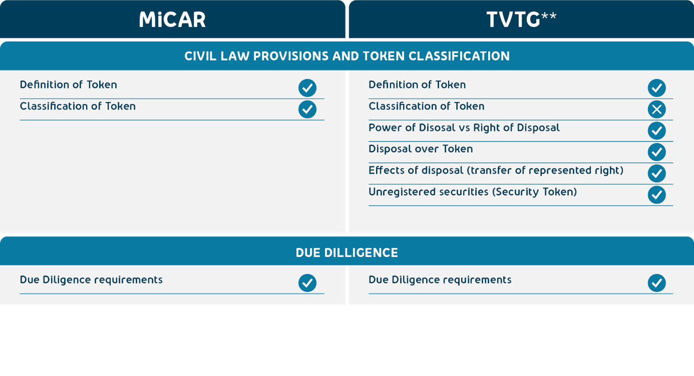 In order to maintain its pioneering role in the crypto sector, the government of Liechtenstein has submitted a proposal for an early amendment to the TVTG in preparation for MiCAR: The goal is to integrate certain MiCAR-CASP service providers into the TVTG even before it applies in the EU, and to create legal certainty during the transition from the Blockchain Law to MiCAR. The introduction of a new service provider role for lending and staking is also planned. Thus, Liechtenstein offers an added value of legal certainty and more than just MiCAR.